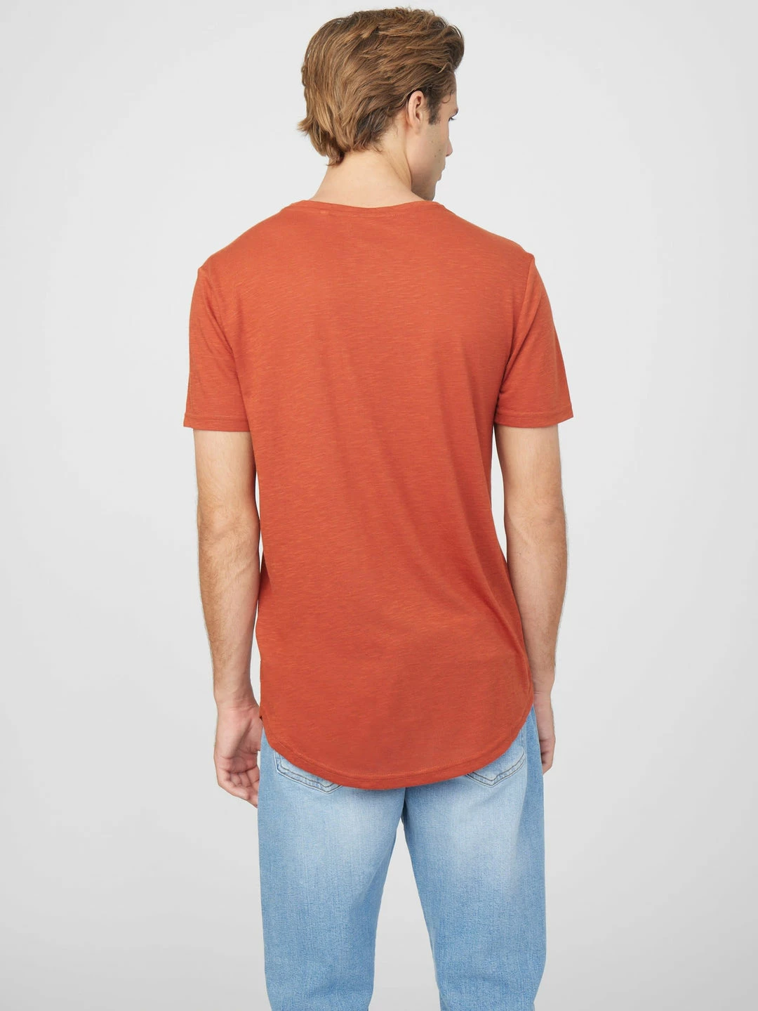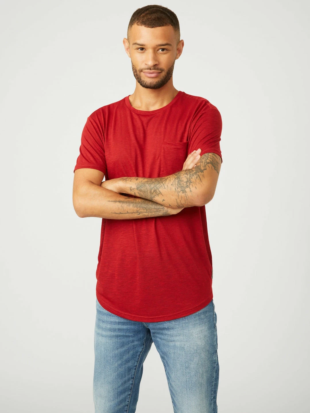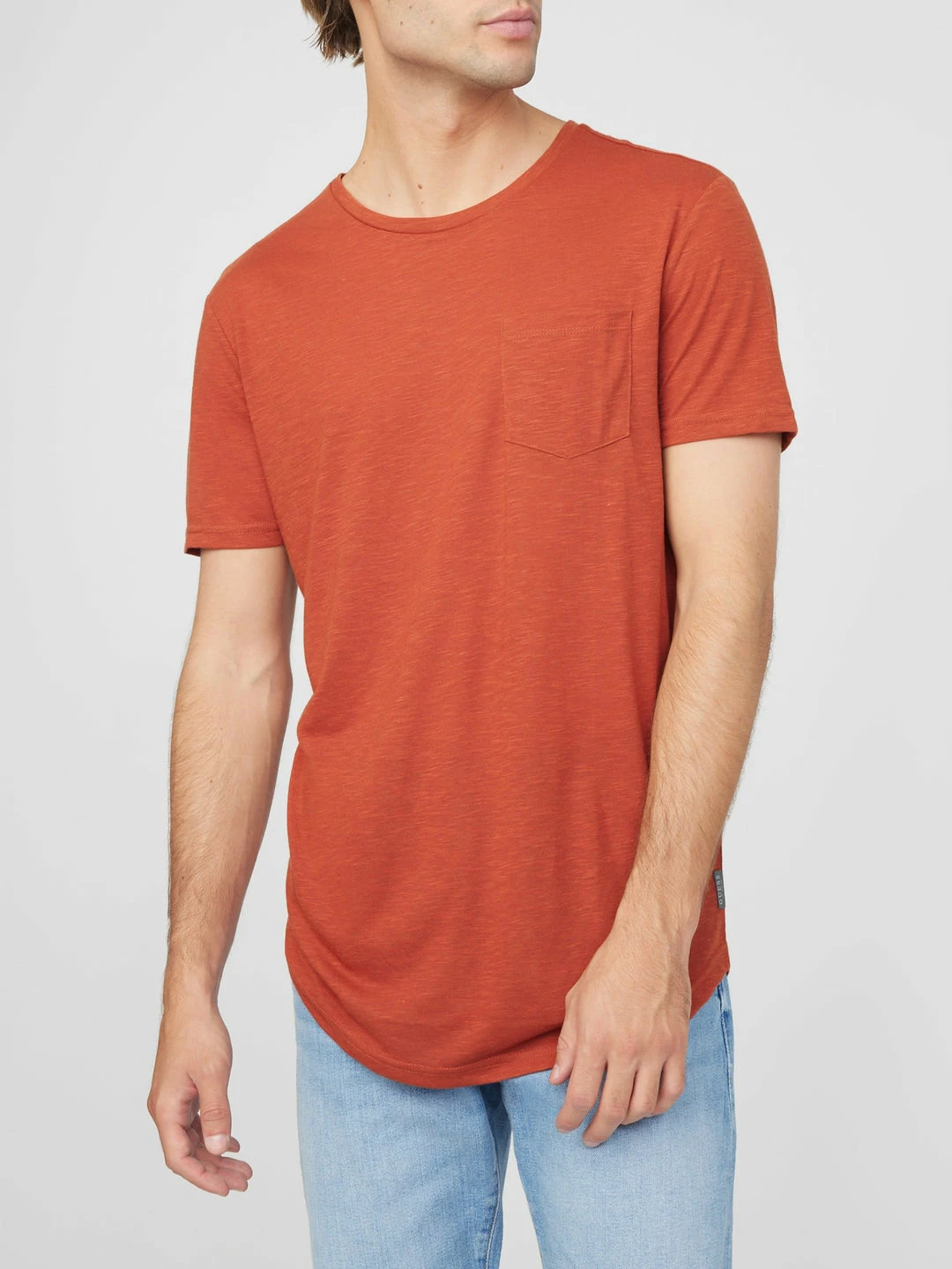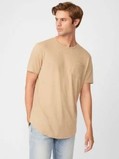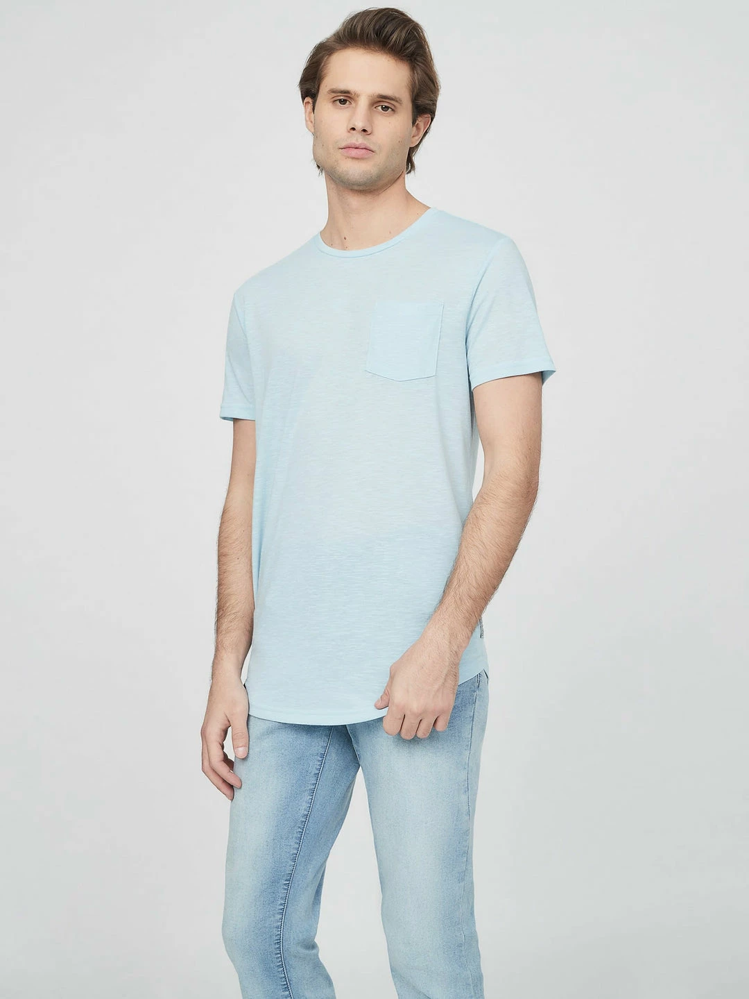 An everyday option, this tee is fitted with a crew neckline and short sleeves. Designed with a single chest pocket and a curved longline hem.