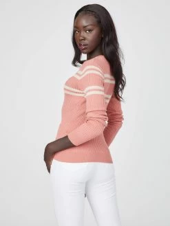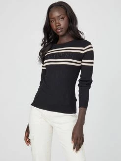 A chic staple, this rib-knit sweater features a crew neck and minimalist striped design with monochromatic embroidered logo detail.