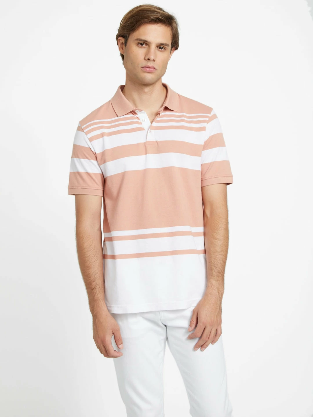 Two-tone stripes make up this piquet polo featuring a folded collar, button placket and short sleeves.