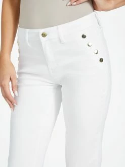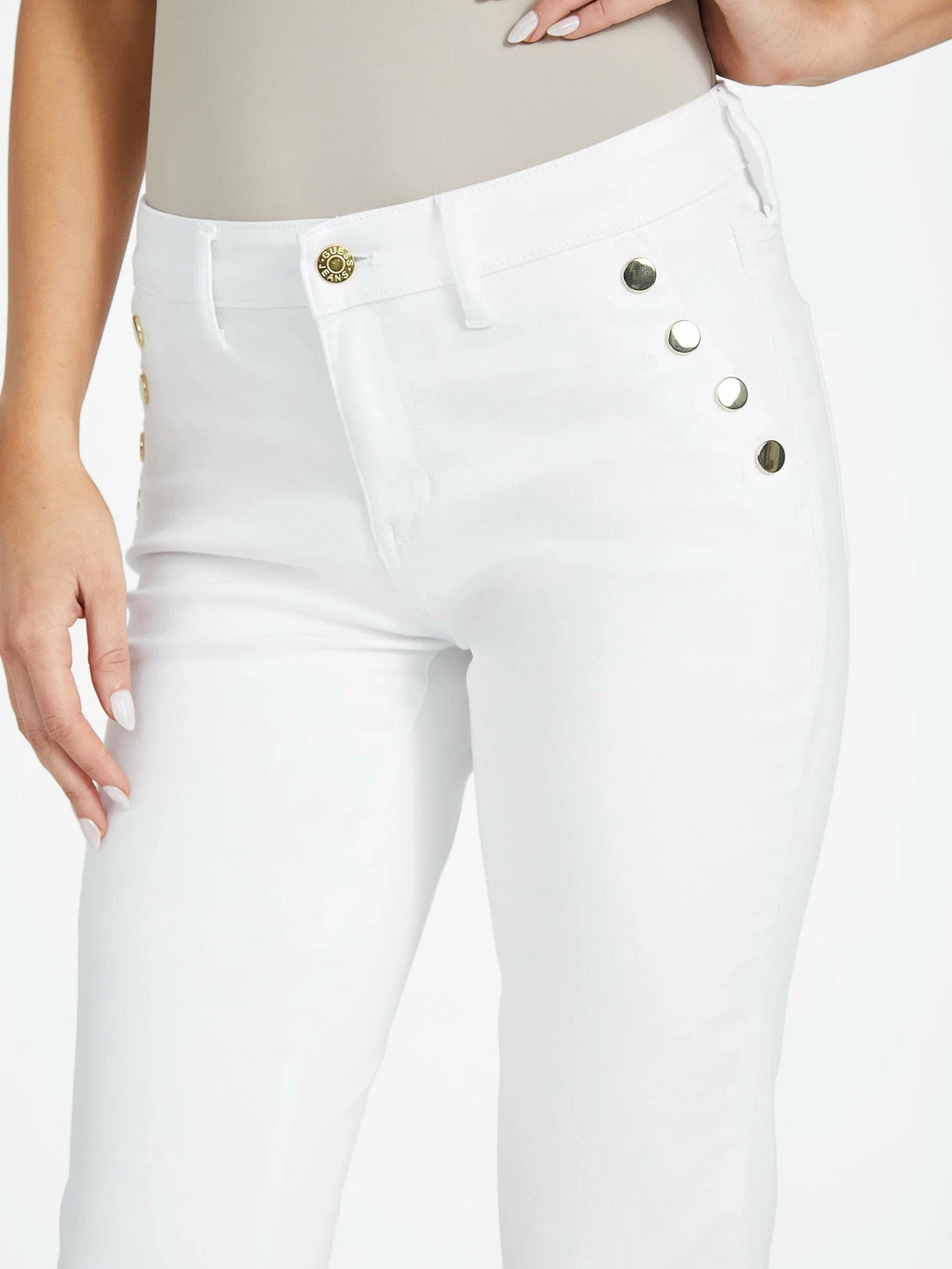 Crafted in a stretch-denim fabrication for a curve-highlighting fit, this pair of jeans features a mid-rise waist with sailor button detailing on the sides. Finished by a flared leg for added dimension.