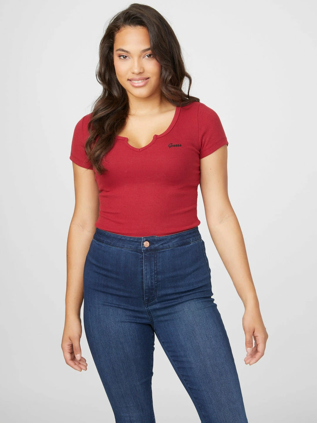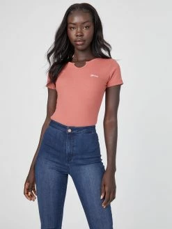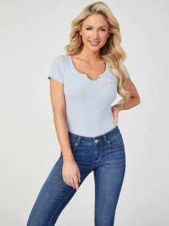 A must-have basic, this ribbed knit tee features short sleeves, a notched V detail at the neckline and an embroidered logo.